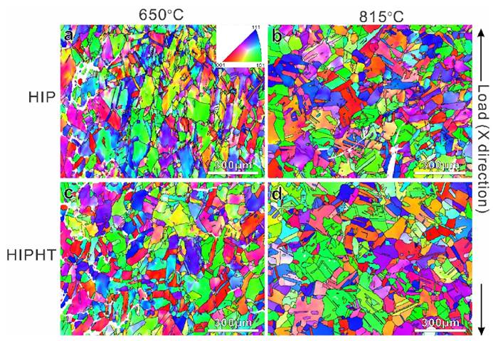 两种处理条件下的晶粒均为等轴晶粒,且在650°C蠕变测试后,晶粒沿加载方向显著拉长。而在815°C下,HIPHT样品的晶粒结构保持等轴状态,表明晶界滑动在高温下更为显著。