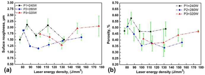 Ev=P/(v×t×h))为参考,探讨试样的表面粗糙度、孔隙度、硬度与工艺参数的关系。表面粗糙度的结果显示,Ev和P的减少会降低熔池的流动性和润湿性,两者的增加则会导致熔池表面张力上升,同时,