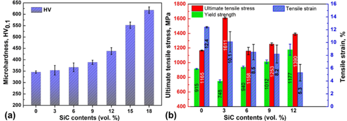 HV0.1。它的延性变化趋势相反,随着SiC含量的增加而逐渐降低至5.3%。它的极限抗拉强度(UTS)的变化趋势不同,在SiC含量为3 vol%时达到最高极限抗拉强度1611 MPa,远高于马氏体高强钢的极限抗拉强度。