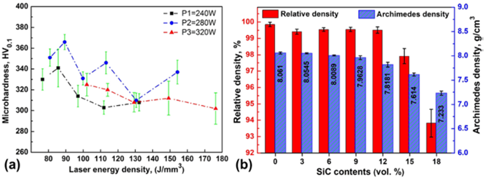 图2 激光参数对LPBF制备的M9 MMCs (a)显微硬度的影响,以及(b)不同SiC含量的LPBF制备的MMCs的孔隙率和阿基米德密度
