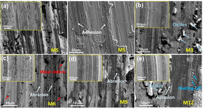 图6 摩擦磨损试验后MS和MMCs磨损表面的扫描电镜图像