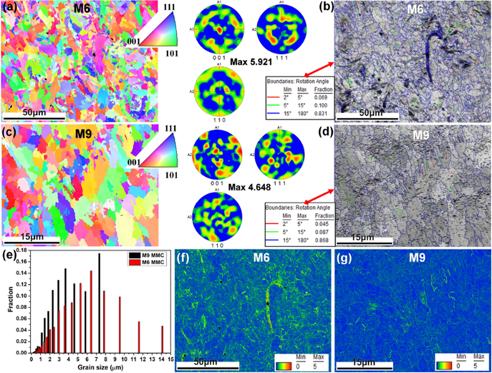 图4 M6和M9 MMCs样品的EBSD分析:(a) M6的IPF和PFs,(b) M6的晶界图,(c) M9的IPF和PFs,(d) M9的晶界图,(e) M6和M9的晶粒尺寸分布,(f)和(g)分别为M6和M9的KAM图