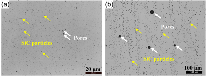 图3 SiC颗粒在LPBF处理(a) M9和(b) M12样品中的分布![]()